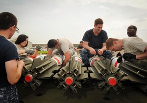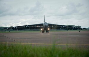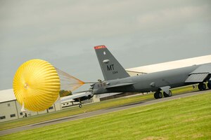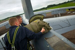 U.S. Air Force Staff Sgts. Matthew Hardwig and Justin Yochum, 5th Expeditionary Maintenance Squadron aerospace repair and reclamation craftsman and journeyman, replace a drag chute on a B-52H Stratofortress at RAF Fairford, United Kingdom, June 13, 2016, following a Saber Strike 16 mission. The drag