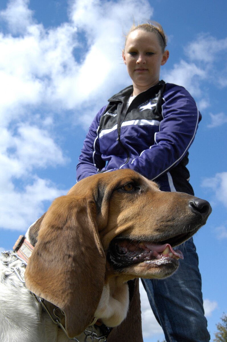 WHITEMAN AIR FORCE BASE, Mo. - Sam, a basset hound, stands with his owner, Jenny Hanson, Oct. 2, as they wait to register for the 2010 Whiteman Bark in the Park at Ike Skelton Park. The annual event was hosted by the Whiteman Community Activities Center and Vet Clinic and is part of the Air Force Global Strike Command values for Airmen moral and welfare. (U.S. Air Force photo/Senior Airman Jason Barebo)