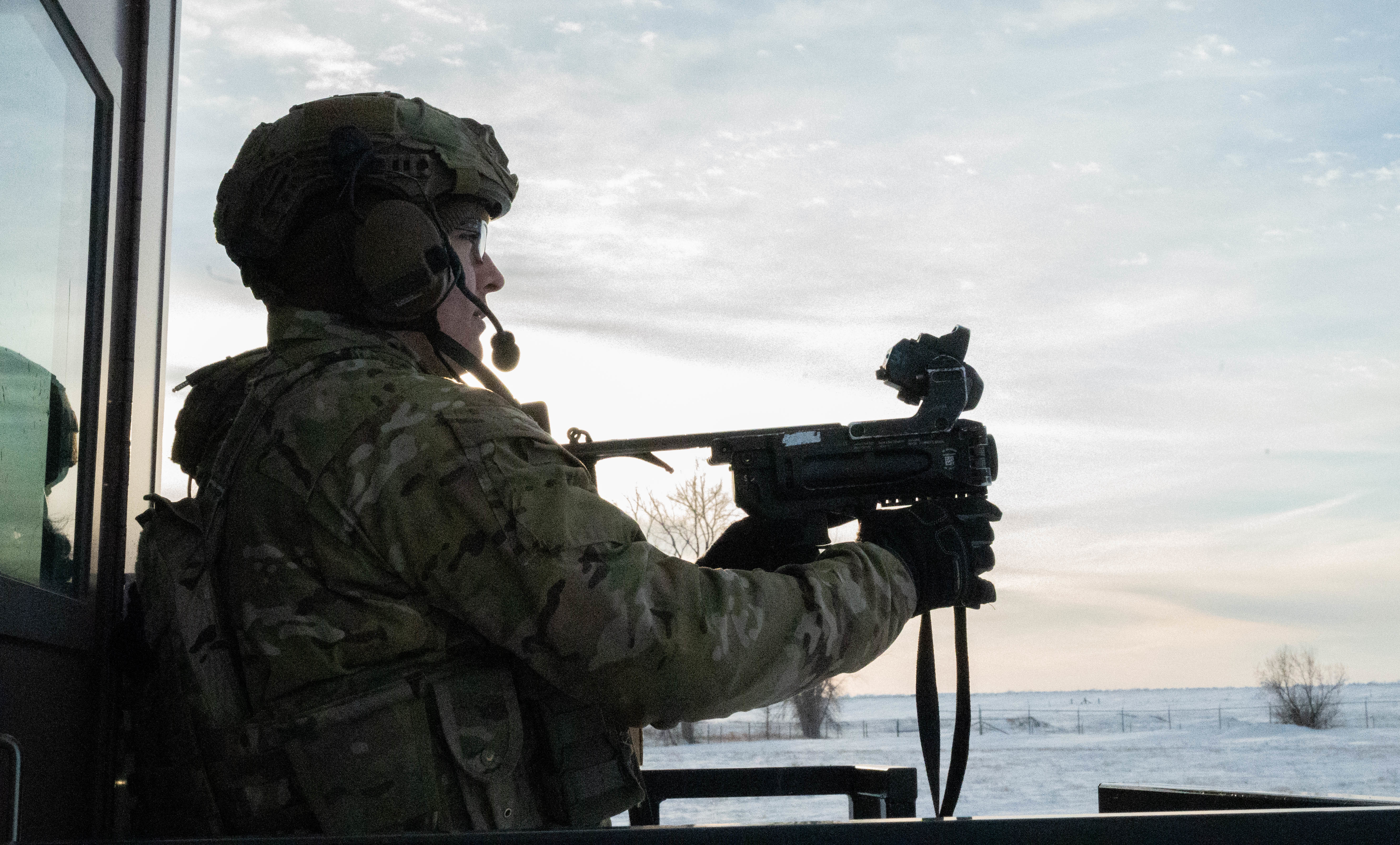 Airman Paridy Seng, 5th Security Forces Squadron defender, shoots an M320A1 Grenade Launcher with the help of alternate gunner Airman 1st Class Isaac Mann, 5SFS defender, at Minot Air Force Base, North Dakota, Jan. 30, 2025. An alternate gunner is used when firing the M320A1 Grenade Launcher to help the shooter reload by passing over rounds and giving aiming adjustments. (U.S. Air Force photo by Airman 1st Class Wesley Davies)