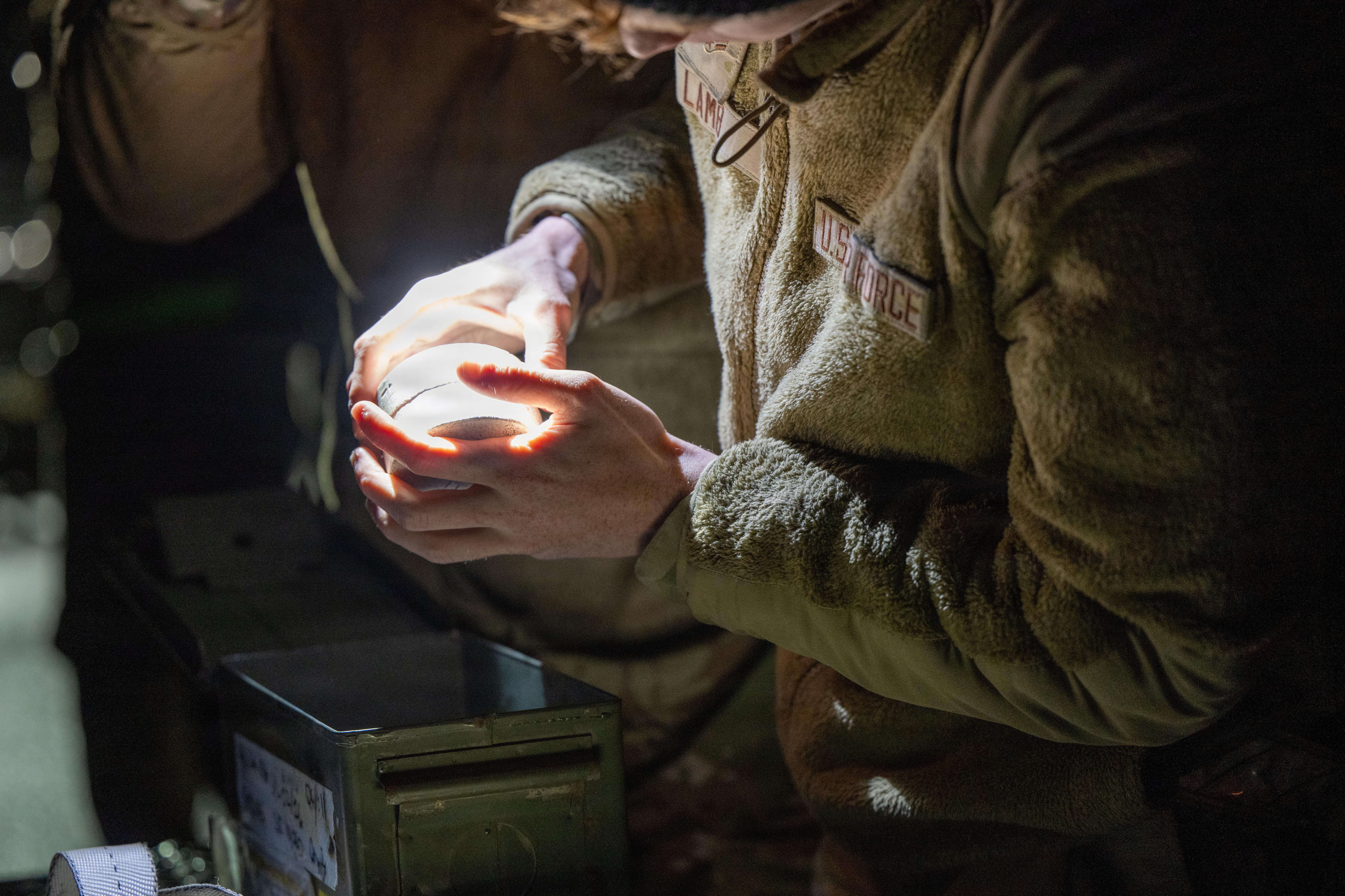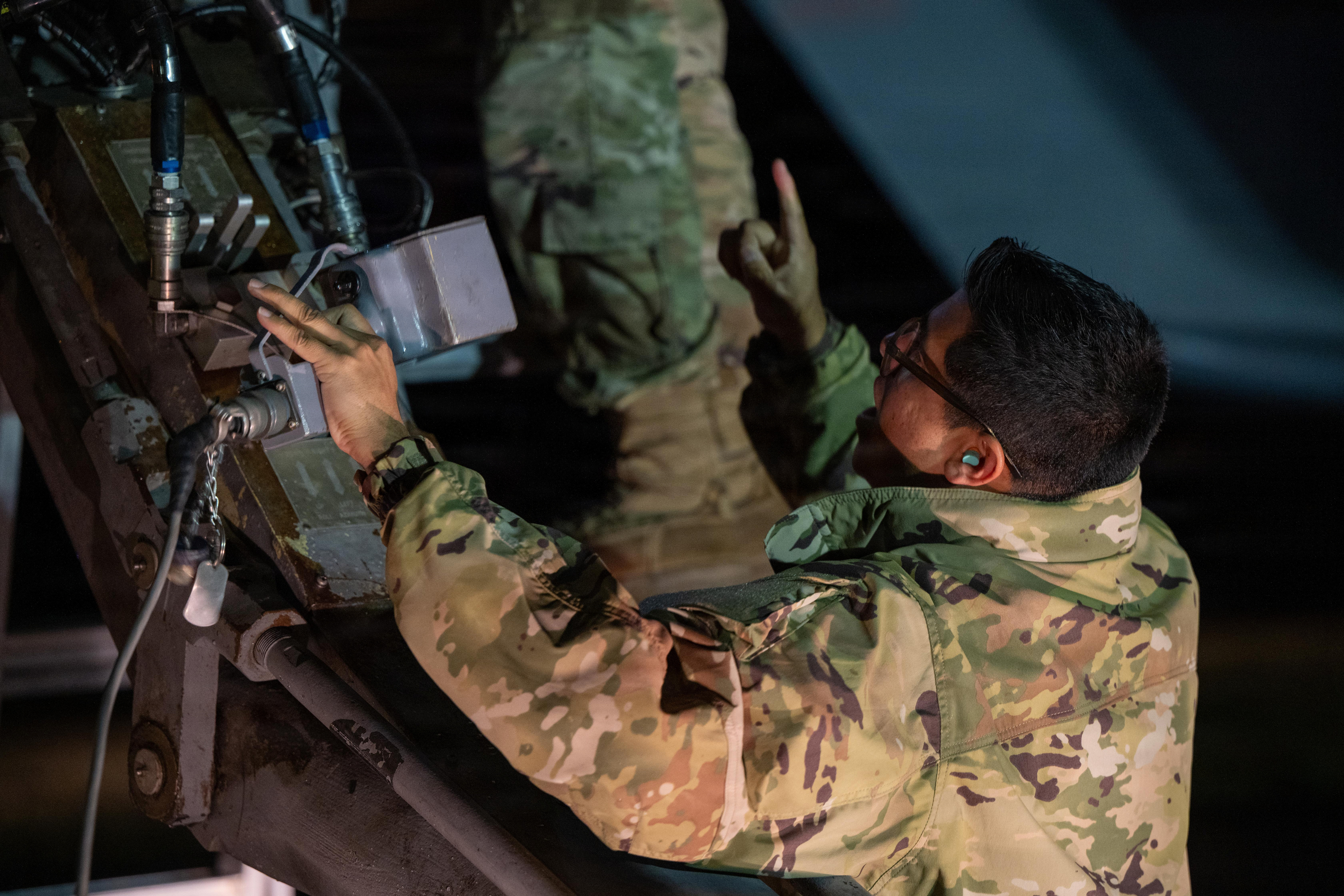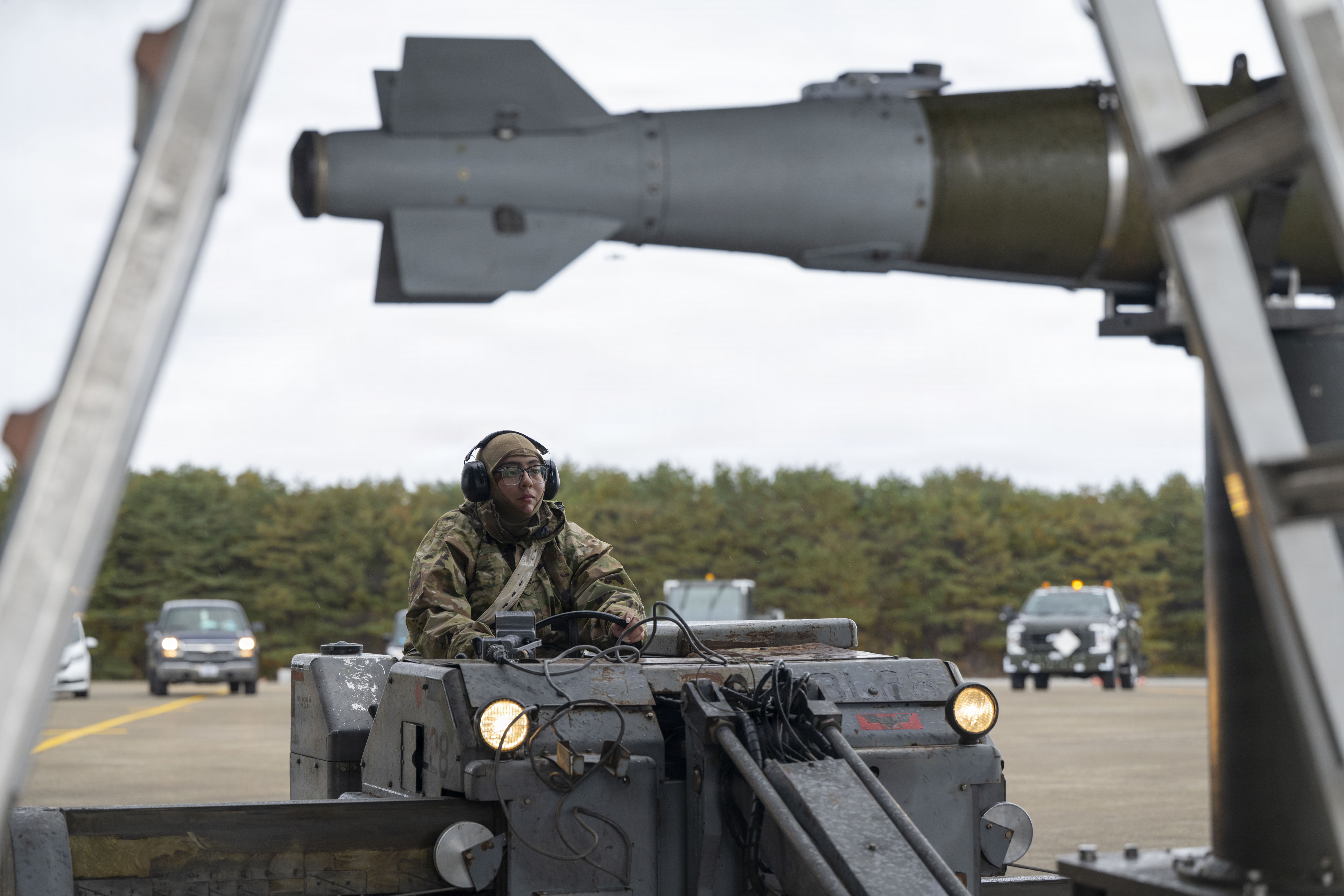 U.S. Air Force Staff Sgt. Linda Chico, 9th Expeditionary Bomb Squadron weapons load crew chief, and Senior Airman Jayson North, 9th EBS weapons load crew member, prepare to secure a GBU-54 bomb in the weapons bay of a B-1B Lancer during a bomber task force weapons load at Misawa Air Base, Japan, Nov. 10, 2025. BTF deployments deter potential adversaries, reassure partners, and enhance U.S. readiness and rapid global power projection. (U.S. Air Force photo by Senior Airman Emma Anderson)