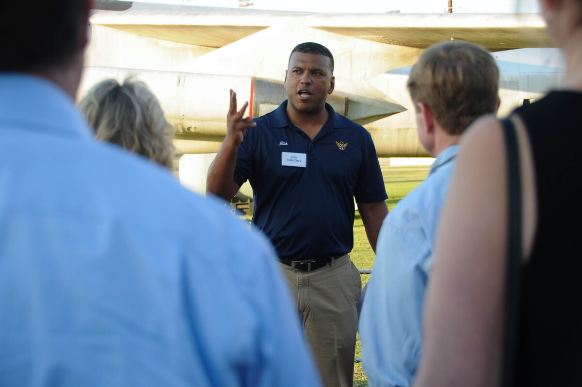 Warren Ward from Air Force Global Strike Command discusses elements of Operation Senior Surprise with Joe and Susan Pierce, Eighth Air Force Consultation Committee members, and Don Horton, an Air Force Global Strike Command civic leader, during an event at the Global Power Museum on Barksdale Air Force Base, La., Sept. 8, 2016. Operation Senior Surprise, also known as "Secret Squirrel," began the bombing campaign against Iraq during the Gulf War in 1991. It kicked off Operation Desert Storm and the liberation of Kuwait. (U.S. Air Force photo by A1C Stuart Bright)