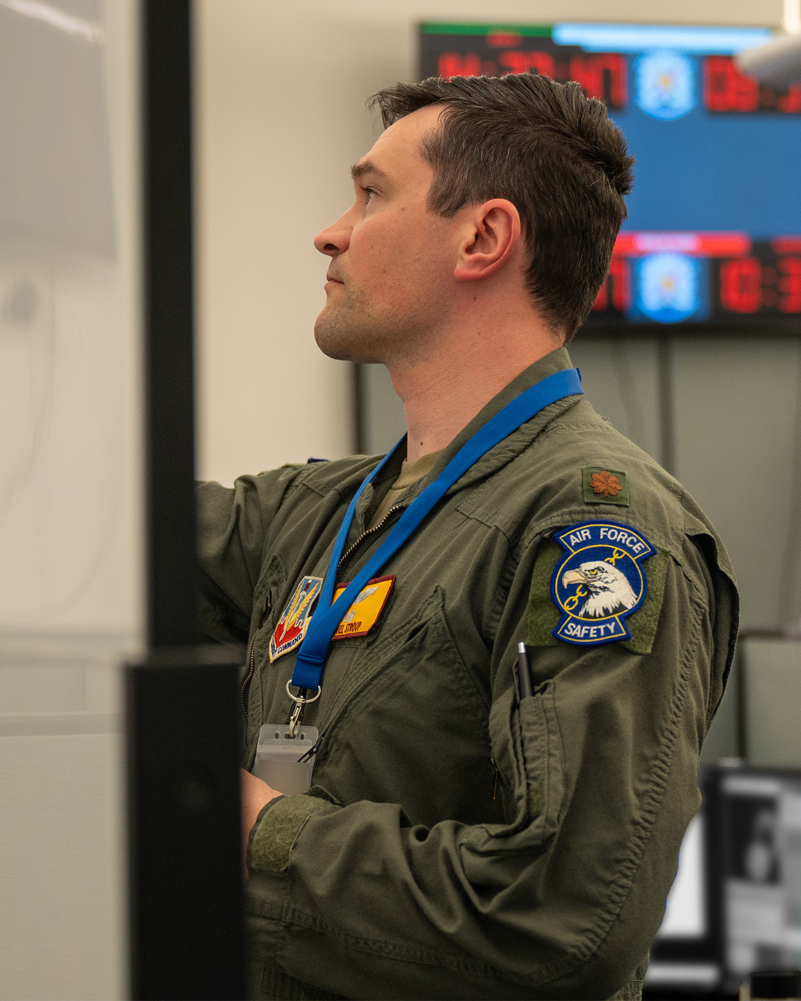 17th Attack Squadron MQ-9 pilots fly in Bamboo Eagle 25-3, a combat-realistic scenario in combined live-fly, virtual, and constructive exercise, at the 705th Combat Training Squadron, also known as the Distributed Mission Operations Center at Kirtland Air Force Base, New Mexico, on Aug. 5, 2025. The DMOC's live, virtual, and constructive, or LVC, training environment provides a high-fidelity proving ground where commanders and battle managers can practice decision-making in contested, degraded, and operationally complex environments without risk to life or assets. (Screens and whiteboards were blurred and security badges were removed for security purposes. Photo cropped to focus on subject.) (U.S. Air Force photo by Amn Alenne Mojica)