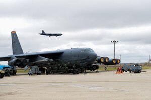 B-52H Stratofortresses from the 2nd Bomb Wing line up on the runway as part of a readiness exercise before taking off. The 2nd Bomb Wing conducts exercises to ensure the ability to present uncompromising combat capacity.